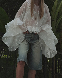 Шила блузку для дочери. Ткань - хлопковый батист с мушками, полупрозрачный и пластичный, мнется несильно.