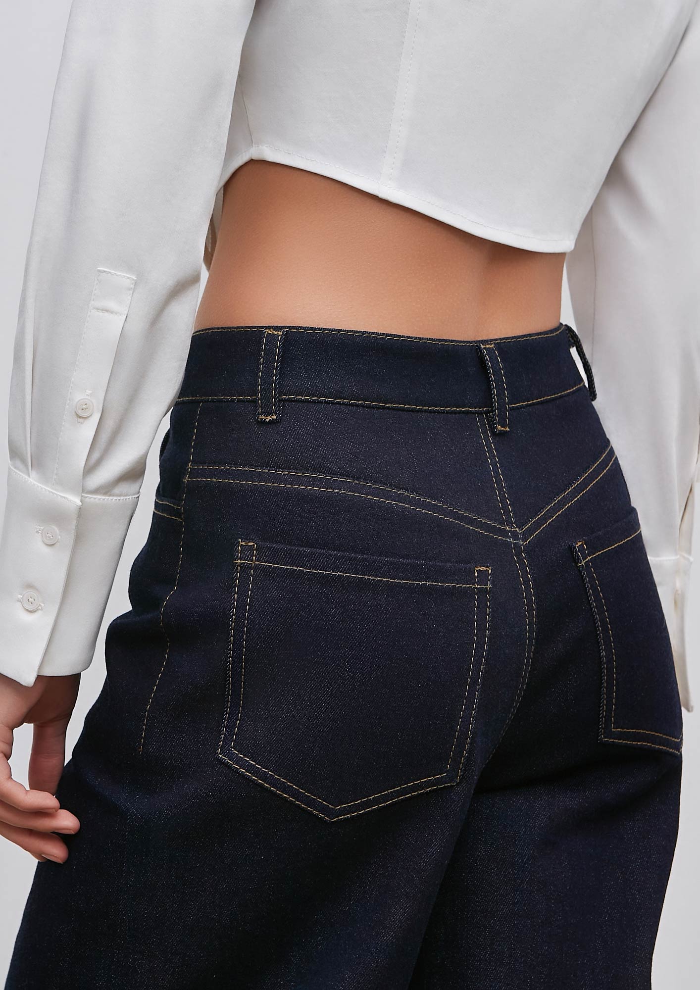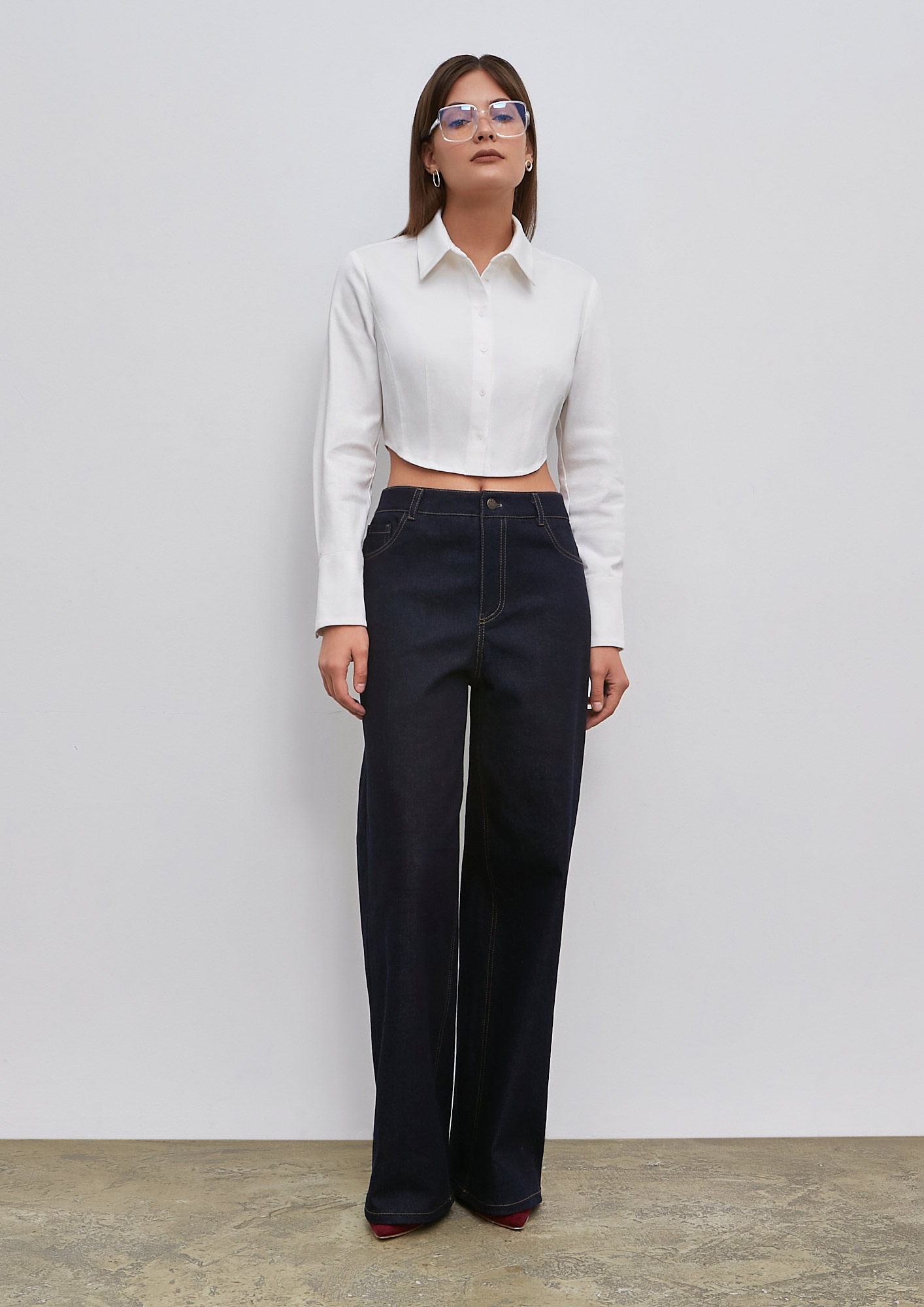 Шила из денима. Немного свободно в талии, рубашка отходит от тела, но можно носить и в свободном стиле.