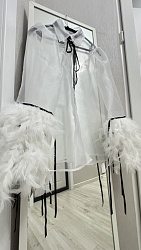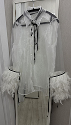В целом рубашка красивая, но вот плечи для такого рукава показались сильно спущены, корректировала, приподнимала. Воротник понравился в застегнутом виде. Обрабатывала роликовым швом. Получилось очень аккуратно. Но кроить и шить из органзы мне было сложно. Опыта совсем немного.