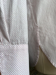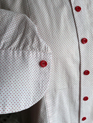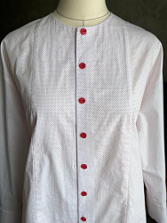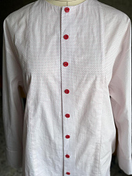 Необычная рубашка из-за отсутствия воротника. Из-за больших прибавок, взяла на размер меньше.
