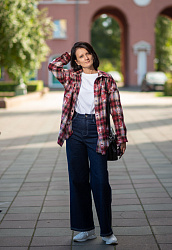 Рубашка очень свободная. Взяла на размер меньше. Для меня оказался коротковат рукав, я бы удлинила примерно на 3 см.