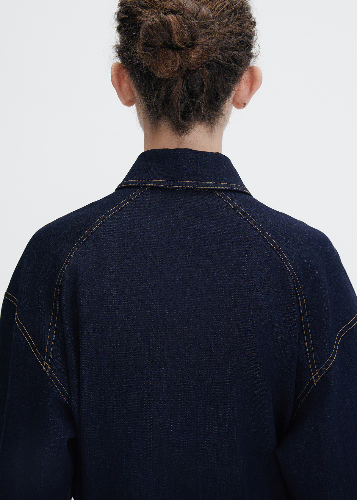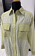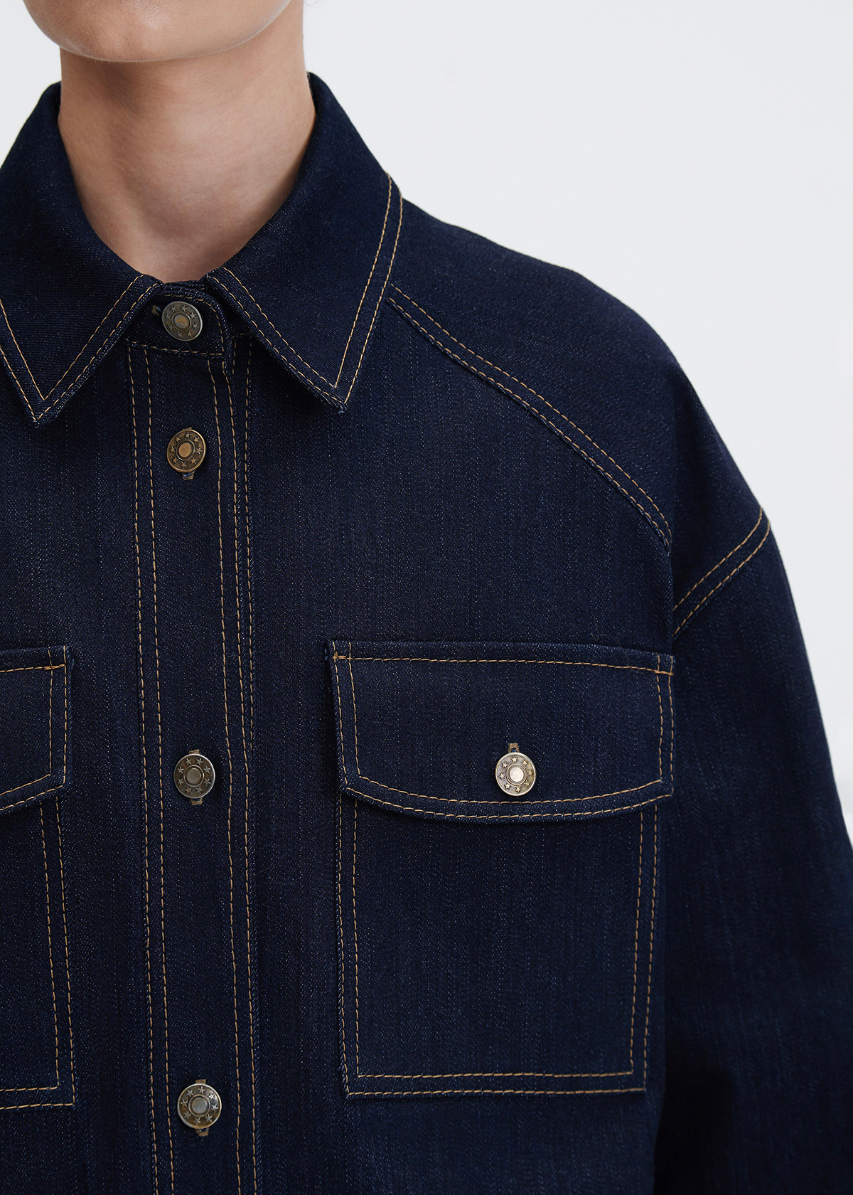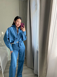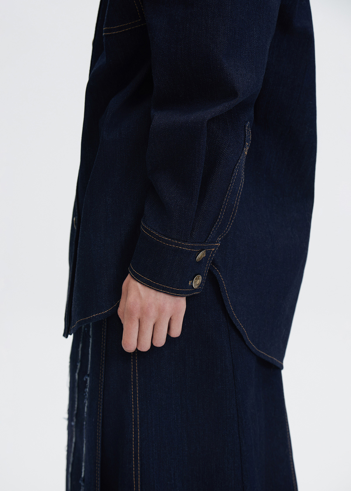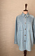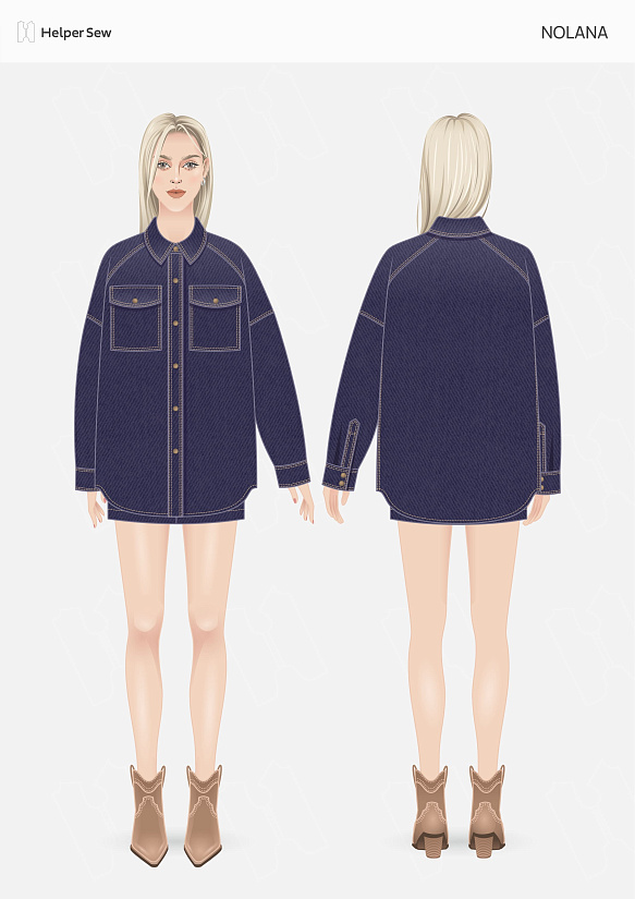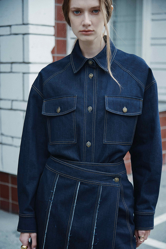 Рубашка прямого силуэта, с рукавом реглан, с центральной открытой застежкой на 6 прорезных петель и 6 пуговиц на притачной планке. На переде накладные карманы с клапанами, с застежкой на 1 прорезную петлю и 1 пуговицу. Низ клапанов фигурный. Низ рубашки фигурный в области боковых швов. Рукав рубашечный, с горизонтальным подрезом в области плеча, длинный, с притачной манжетой застегивающейся на 1 прорезную петлю и 1 пуговицу, с притачной планкой по разрезу. По низу рукава складка. Воротник стояче-отложной, с отрезной стойкой. Рубашка сшита из джинсовой ткани, состав хлопок 100%, плотность 240 гр/м².