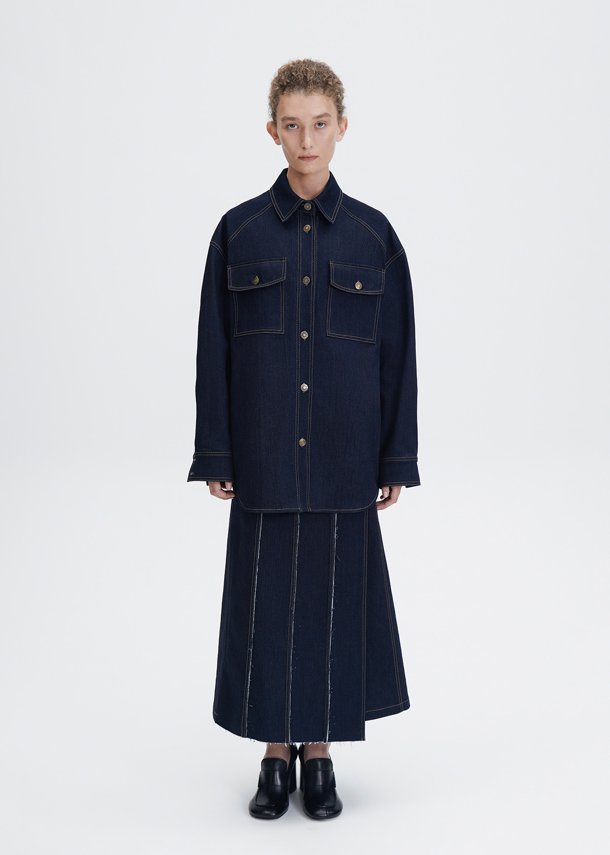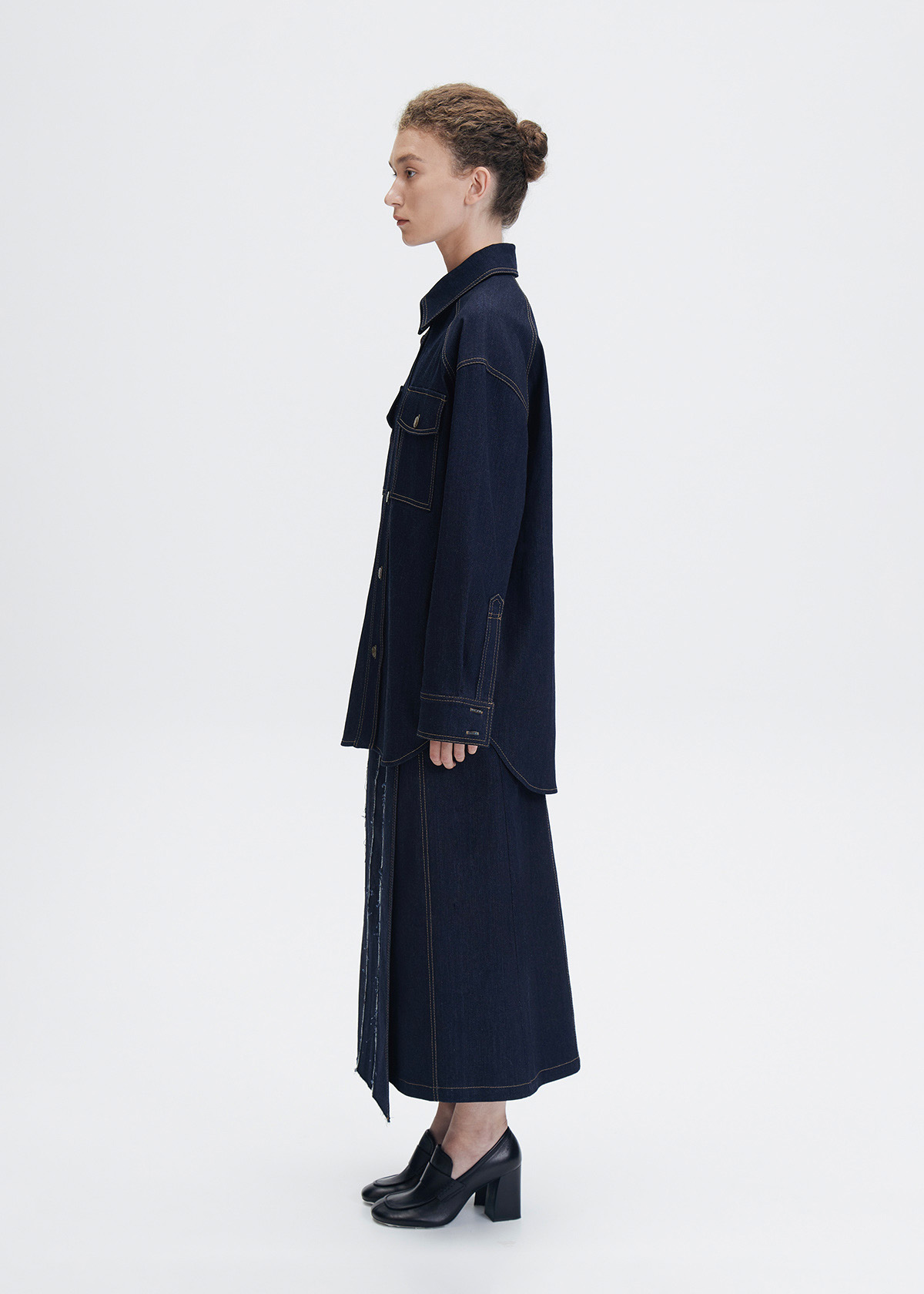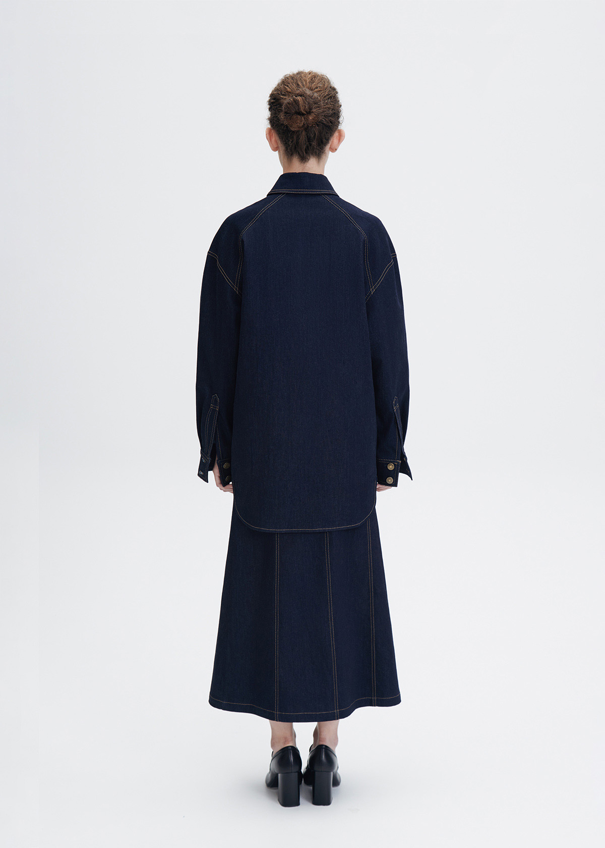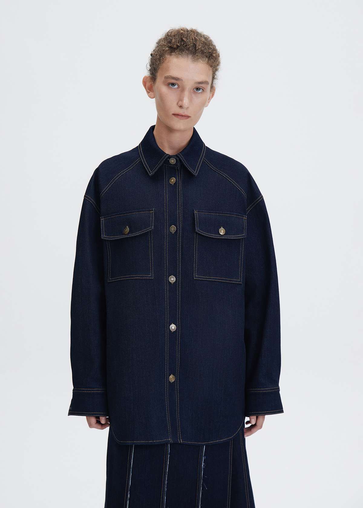 Рубашка прямого силуэта, с рукавом реглан, с центральной открытой застежкой на 6 прорезных петель и 6 пуговиц на притачной планке. На переде накладные карманы с клапанами, с застежкой на 1 прорезную петлю и 1 пуговицу. Низ клапанов фигурный. Низ рубашки фигурный в области боковых швов. Рукав рубашечный, с горизонтальным подрезом в области плеча, длинный, с притачной манжетой застегивающейся на 1 прорезную петлю и 1 пуговицу, с притачной планкой по разрезу. По низу рукава складка. Воротник стояче-отложной, с отрезной стойкой. Рубашка сшита из джинсовой ткани, состав хлопок 100%, плотность 240 гр/м².