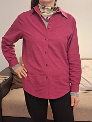 Шила из польского хлопка, ткань сделала изделие нетривиальным и наиболее подходящим для носки вторым слоем. Рубашка чуть великовата на ОГ 101, возможно, дело не в моей полнотной группе, моя - 1я, здесь 2я по умолчанию. Ничего не меняла, кроме как воротник убрала, оставила только стойку. В целом выкройка хороша, но теперь я поклонница выкроек с возможностью выбора полнотной группы.