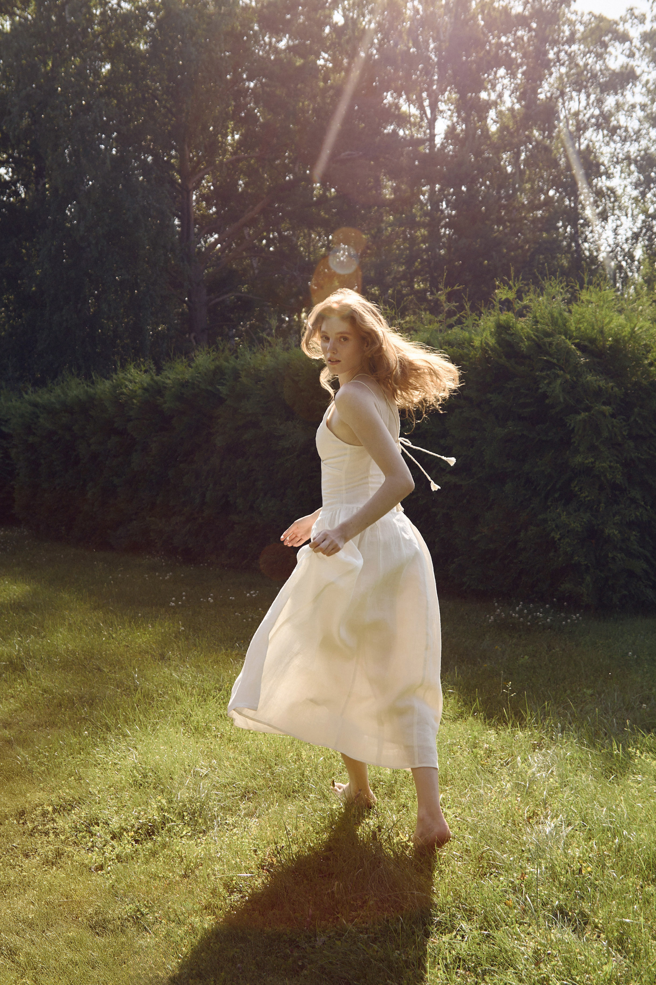 Шила из стиранного хлопка, на подкладке батист. Мне больше нравится сарафан на модели из белой тонкой ткани, как-то более легко и воздушно.