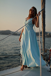 Очень комфортный сарафан. Многие обращают внимание. Даже при своем росте 160 и наличием живота в сарафане данной модели светлого цвета не смотрелась как кукла на чайнике, ну максимум как медведица. Ткань - батист. В жару в Сочи было очень комфортно.