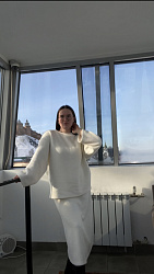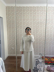 Сшила костюм, джемпер плюс юбка за 2.5 часа. Оч просто, без корректировок село. Длина что надо. Ношу и без корректировок. Из-за того, что у меня не трикотаж, горловину выкроила по косой, низы подшила потайным швом.