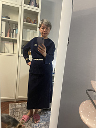 Сшила из искусственного бархата, получился костюм с юбкой Enid. Из-за того, что материал плохо тянется, горловину пришлось просто обработать киперной лентой. Добавила манжеты из шитья. В целом посадка понравилась. Весь костюм вместе со сборкой выкроек и раскроем получился за 6 часов.