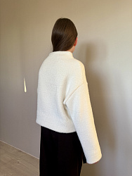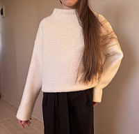 Сшила для дочки 11 лет свитер, взяла самый маленький размер, сел хорошо, но для школы жарко будет. Шьётся легко, все собрала на оверлоке и ручным швом закрепила рукава, ворот и по низу.