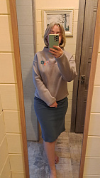 Спасибо всей команде Хелперсью. Выбрала эту выкройку из-за ворота, люблю такое. Сшила с юбкой Mali, получился супер костюм. Шила из Джерси с кашемиром. Изменений не вносила в выкройку.