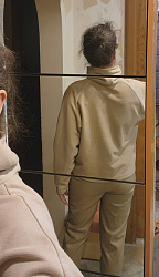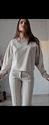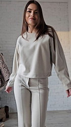 Свитер шила из костюмного трикотажа, обрабатывала швы косой бейкой. Ткань тянется совсем слегка и довольно плотная, поэтому решила вместо высокого горла сделать обтачку. Выкройка понравилась, повторю в вязаном трикотаже обязательно. На фото в комплекте с брюками Ann