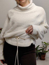 Замечательная модель свитера с объемными рукавами. Шьётся очень быстро. Воротник достаточно объемный. Я уместилась в метраж 1,2 м при ширине 1,6 м впритык.