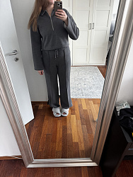 Шила костюм с брюками Ida из трикотажа Джерси антипиллинг плотностью 520 гр/м, не учла нюансы работы с тракторной молнией, с втачиванием были проблемы, длину увеличила на 10 см. Не нравится как смотрится изделие при расстёгнутой молнии, я бы доработала этот узел, возможно здесь была бы актуальна обтачка. Рукава мне, к сожалению, тоже кажутся несколько коротковаты, но не критично. Торопилась сшить к поездке, притачала воротник не той стороной 🫣, но так как на брюках присутствуют стрелки с отсрочкой , показалось не критичным, переделывать не стала. Шьётся быстро и легко, модель популярная и комфортная, думаю что повторю пошив в футере