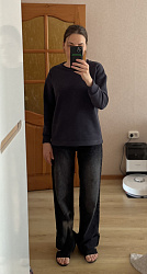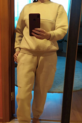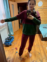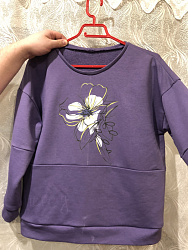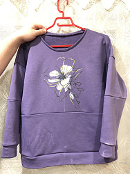 Свитшотом довольна. Брала свой 42 размер. Из изменений: вместо резинки из кашкорсе удлинила свитшот на 8 см. Носить буду)
