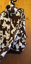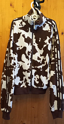 Выкройка идеально подошла под мою задумку. Вдохновилась нашим дизайнером - стилистом КК. Долго возилась с лампасами - коричневые готовые я, конечно же, нигде не нашла, делала сама из вискозного трикотажа стретч, очень нестабильный. Результатом довольна. В оригинале лампасы ещё на бочках где карманы, но мои нервные клетки уже закончились