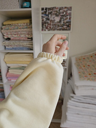 Не повезло с родным кашкорсе. Оказалось очень тонким, поэтому в манжеты и низ изделия вставила резинку.