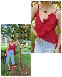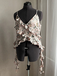 Очень классный топ! Боялась, что не справлюсь с шифоном и запутаюсь с воланами, но инструкция понятная оказалась. Отрез лежал долго, ждал своей выкройки.