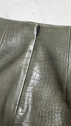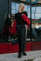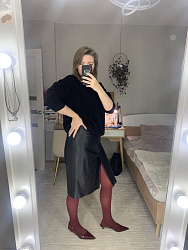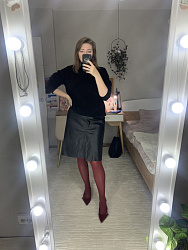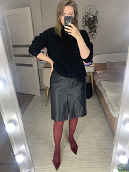 Юбка из экокожи. Из изменений: подняла шлицу на 5 см. и удлинила. Попала в просак когда обрабатывала шлицу. В инструкции было сказано "сложить основную ткань и подкладку лицевыми сторонами".. Так я и не особо задумывась, т. к. знаю, что инструкции очень подробные, вывернула юбку и обработала одну сторону шлицы (благо дело 1 сторону). И шов отстрочила и припуски подрезала и проклеила их, и всё на совесть. К счастью, решила примерить, а юбка не выворачивается. Итог: будьте внимательны и при обработке шлицы не выворачивайте юбку, а отворачивайте шлицу для обработки