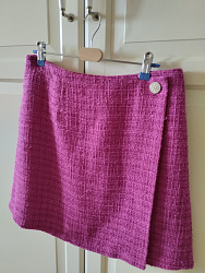 Юбка удобна тем, что можно перешить пуговицу и немного скорректировать талию. У меня букле(твид "шанель")колючее было, поставила подкладку потолще, но всё равно по линии низа немного колется, но это некритично.