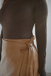 Несложная в пошиве юбка, очень базовый силуэт и интересная обработка пояса. Шить понравилось, инструкция понятная, хоть с экокожей сталкивалась до этого всего пару раз. Планирую шить ещё и из замши. На ОБ 100, ОТ 70 брала 46 размер (ОБ 98) и полнотную группу 2. Село замечательно.