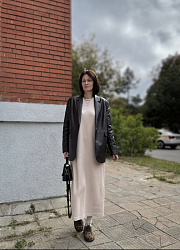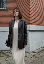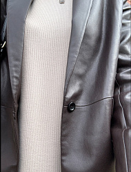 Долго собиралась шить жакет, в итоге сшила его молниеносно. Кожу взяла на замшевой основе, достаточно плотный дублерин. Жакет получился не как на фото, сначала расстроилась, но потом походив в нем поняла что мне достаточно тепло и комфортно. Возможно повторю из тонкой фактурной кожи, хочется сделать его более легким. Очень простая выкройка при всей сложности изделия. Шикарная обработка шлицы, не понадобилась даже инструкция! В общем как обычно любимое бюро удивили. На ОГ 88 рост 173 размер взяла так же 44, рост 173-178