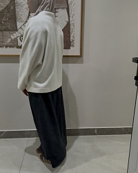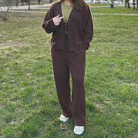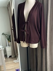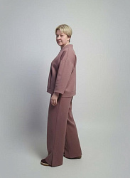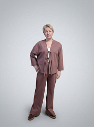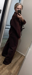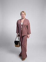 Кардиган и брюки сшила из плотного джерси. Ничего не меняла в выкройке кардигана. Единственная сложность возникла в притачивании планки с завязками к основному изделию, в конце пришлось сильно тянуть руками ткань планки, т.к. понимала, что она не потянет до конца. В итоге, с одной стороны около груди получился пузырь, который я немного подправила вто, но перекос все равно есть. Но это мои плохие навыки работы с оверлоком.