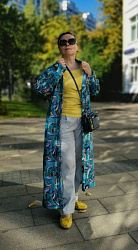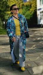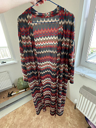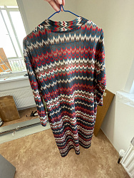 Покупала трикотаж Миссони на маркетплейсе для пошива платья. Но когда получила, поняла, что платье из него вряд ли сошью, потому что трикотаж в мелкую дырочку. Сам отрез решила оставить. Когда увидела выкройку, решила попробовать сшить акцентный кардиган и не ошиблась. Внимание он только так привлекает😍 Одна из моих любимых вещей. Длину укоротила примерно на 10 см, у меня не хватило длины планки по выкройке, длину делала уже под ту длину планки, которая получилась. Но мне не критично, я бы и так укоротила. Сделала пояс и шлевки к нему, и карманы. Пояс не ношу, с ним смотрится как халат. С карманами тоже можно было не заморачиваться, учитывая, что у меня ткань в дырочку. Низ рукавов и подол подгибала на двустороннюю клеевую паутинку. Планку не дублировала (не помню уже, надо было это делать или нет). Чтобы не топорщиться шов на горловине спинки, также приклеила его тонкой паутинкой. Ну и на свой страх и риск я кроила этот трикотаж против долевой нити, так как помимо рисунка эта ткань немного гофрирована и в правильном расположении рисунка по долевой мне не нравилось, как это всё выглядит. Ношу больше года, ничего не перекосилось.