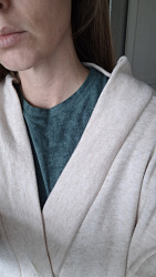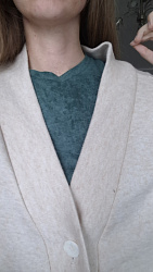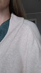По объёму,длине рукавов и изделия-то, что нужно. Нарушен баланс переда и спинки. Плечо уходит вперёд и постоянно нужно поправлять. Плюс планка не ложится совсем. Так как не было времени делать макет, сшила как есть. Если буду шить снова, то сделаю шов на планке, куда уберу избыток . Плюс сделаю коррекцию по себе полотен спинки и переда