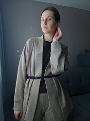 Сшила кардиган из вязаного трикотажа. Изменений в лекала не вносила. Планку дублировала полностью, т. к. трикотаж при частичном дублировании дает усадку. Застежку сделала из магнитных кнопок, сверху пришила пуговицы как декор. В комплект сшила юбку по выкройке Enid, слегка перемоделировала.