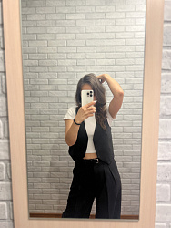 Жилет очень понравился, сшила костюмом с брюками Porte. Тк жилет укороченный, это визуально удлиняет ноги в комплекте с брюками-палаццо.
