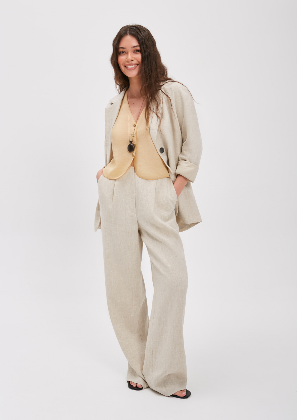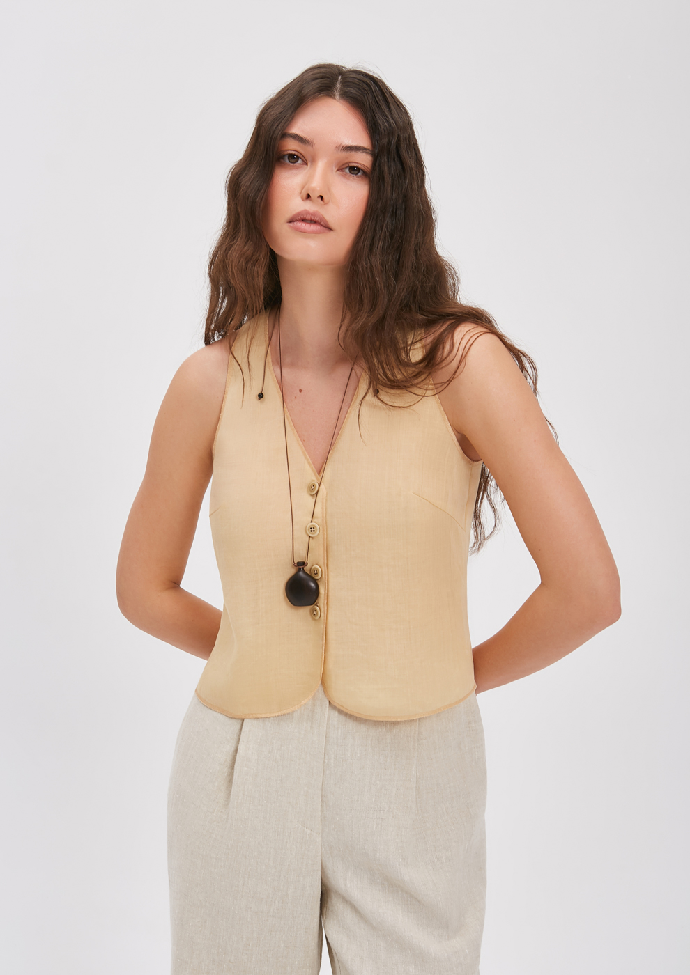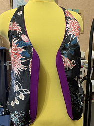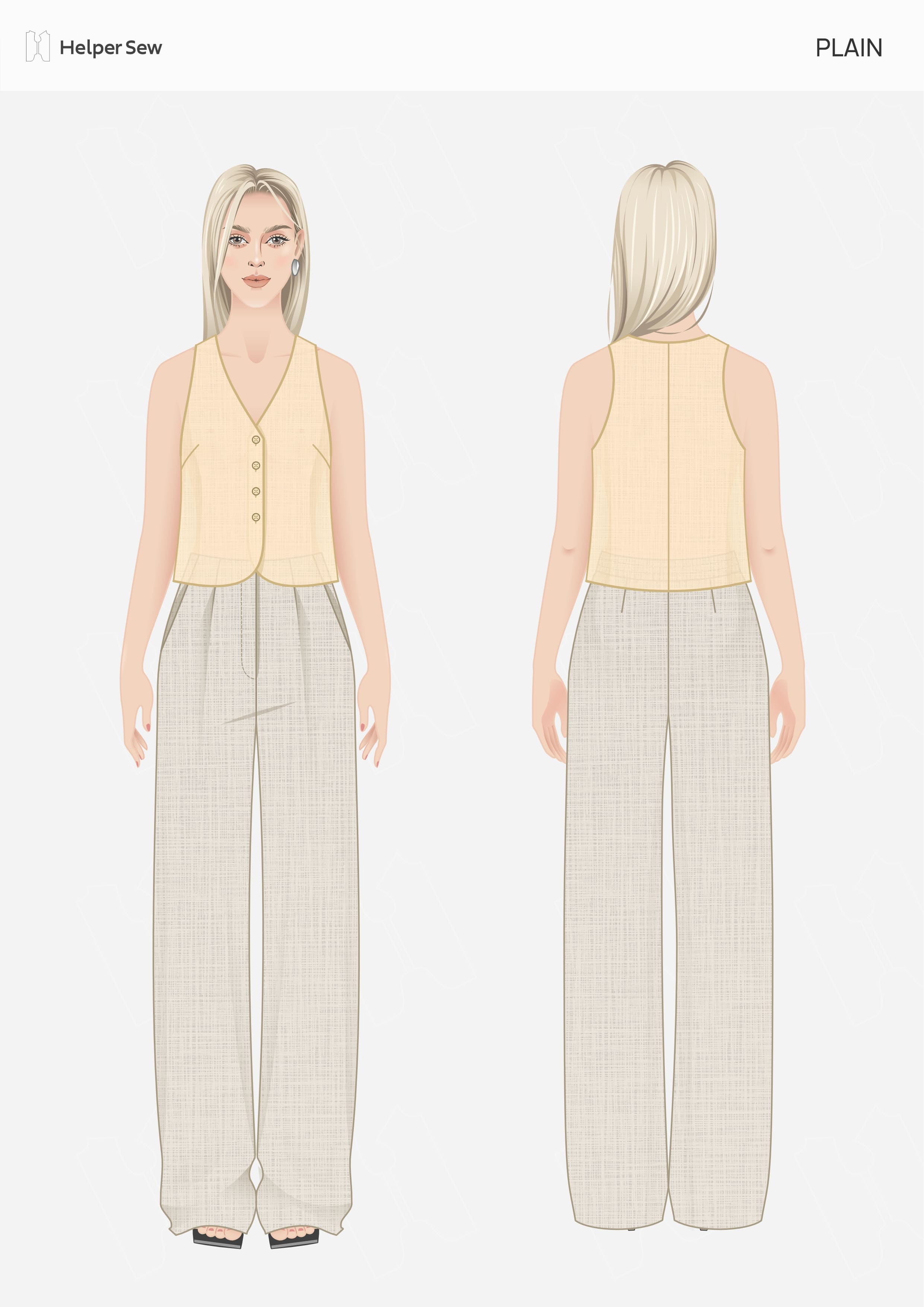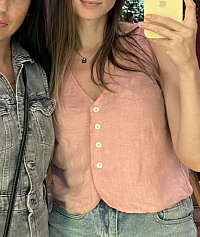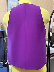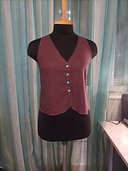 Модель понравилась лаконичностью. Хотела сшить изо льна. Но сшила из костюмной ткани. Брала на юбку, но отрез был 1,2 м. Из остатков сшила жилетку. Посадила на подкладку из шелка. Может быть пришью кнопки. Но это неточно.
