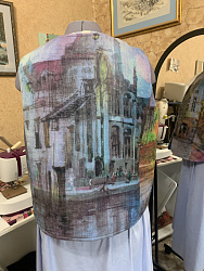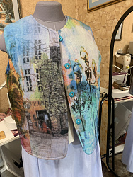Был у меня павлопосадский чистошерстяной палантин, красивый, почти уникальный. Но красоту эту никому толком не было видно. Ситуацию исправила с помощью вашей выкройки жилета. Стежку делала сама и стежила не верх, а подкладку. Вложила тонкий синтепон между двумя слоями подкладочной ткани и слелала ручную стежку всег отреза. Ротом раскроила по лекалам верха жилета По этим же лекалам кроила дтали из палантина. Прострочила по контуру. Конечно, из готовой стежки было бы быстрее. Выкройка точная, но объем мне показался избыточным. Хотя это верхняя одежда. Вероятно так и должно быть. Карманы накладными делать не стала, ими не очень удобно пользоваться. Карманы сделала в швах рельефа. Пришила кнопки вместо пуговиц. Кнопки отпорола со своего старого английского пальто, уж очень они красиво обтянуты тканью нужного мне цвета.