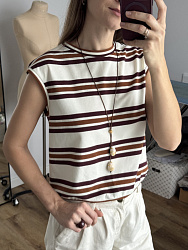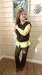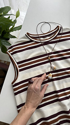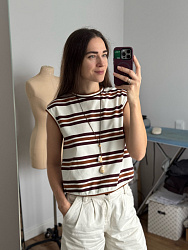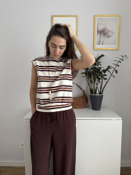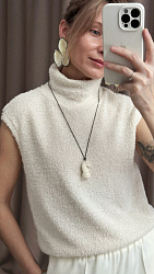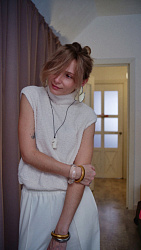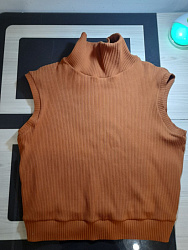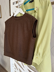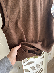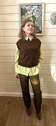 Классическая модель трикотажного жилета. Я, правда, свой ношу первым слоем. Он из вискозного фактурного трикотажа. Даже летом очень комфортно. Корректировок не делала. Шила без примерки, т.к. подобные вещи от Helper на меня "садятся" хорошо. Фото на мне, к сожалению, нет. Но, есть просто отшитая вещь. Планирую к нему сшить длинный кардиган Soul из того же трикотажа.