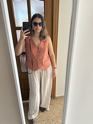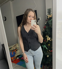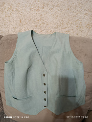 Шила жилет ещё весной из варёного хлопка. Выкройка понятная, ничего не меняла р-р 46 полнотная группа 2. Фото на мне остались в старом телефоне:). Жилет очень удобный, ношу с майкой или футболкой.