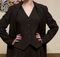 Жилет шился в комплекте с жакетом и брюками. Выкройка не подходит к тканям в полоску, так как плечевая вытачка на спинке ломает рисунок полосок. Но уж как есть.